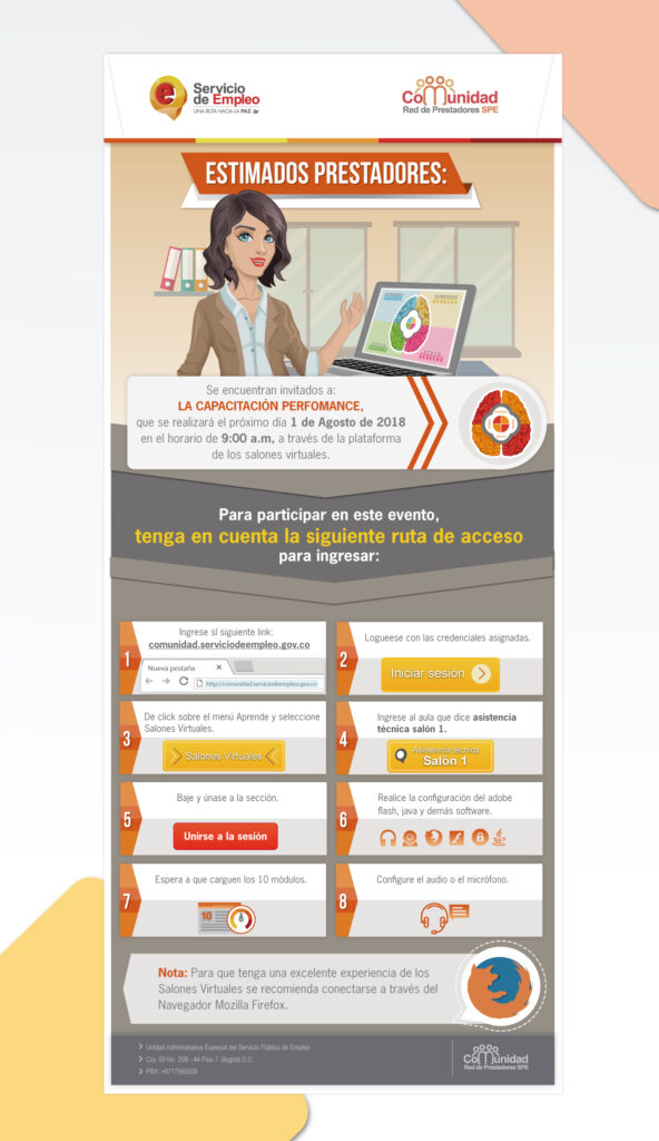 Al trabajar para la compañía de E- learning VCB (Virtual Community Builders) entre 2017 y 2018 se presentó un contrato con el Servicio Público de Empleo del Ministerio de trabajo nacional. En el cual se implementó un LMS para contenidos educativos y formativos para estudiantes de todo el país, también se generaron una serie de contenidos tanto digitales como impresos. Estos incluían además de la plataforma educativa ya mencionada, la elaboración de piezas gráficas de comunicación tanto interna como externa, piezas para redes, mailing, y videos.